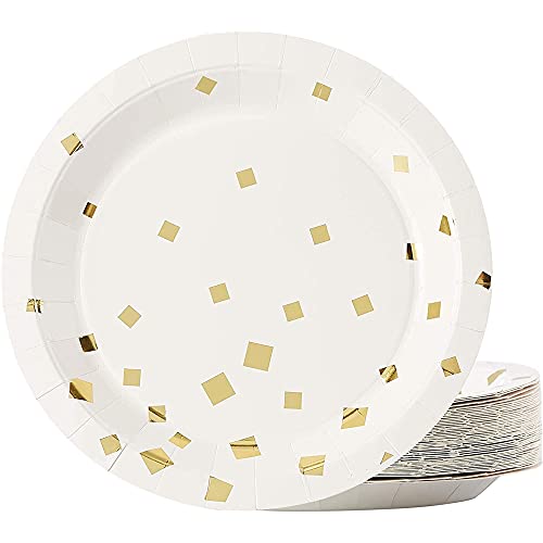 • GOLD PARTY PLATES: Set includes 48 white paper plates featuring gold foil square confetti. It is perfect for any classy and elegant party themes - for birthdays, weddings, holidays, graduation, bridal shower, engagement parties, and just about any happy occasion.